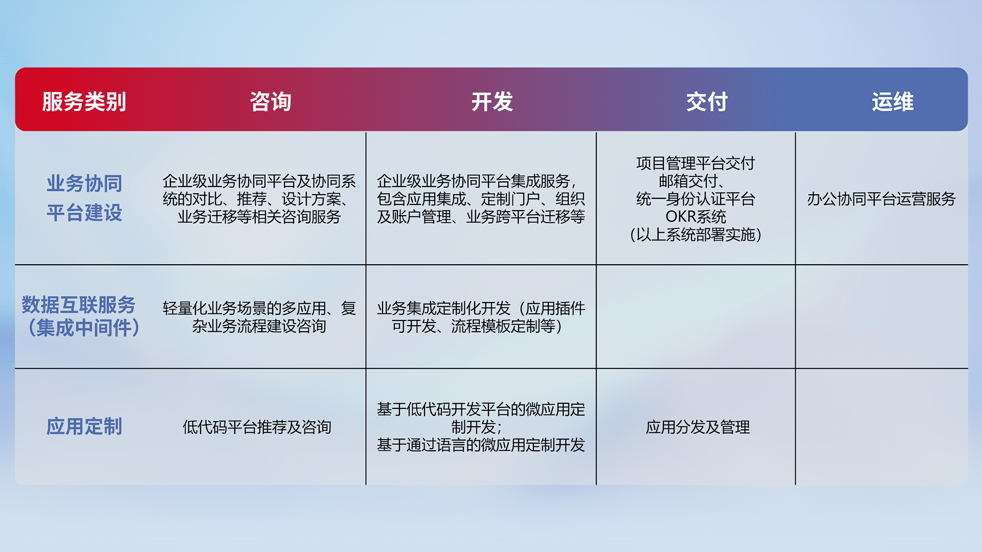 针对钉钉、、、企微、、、IDaas等平台级产品提供产品的规划、、、方案、、交付、、、、定制化开发等服务,,实现如统一协同办公、、智能客户服务、、、混合会议管理、、智能数据查询、、、等业务场景,,实现数字化转型。。。。