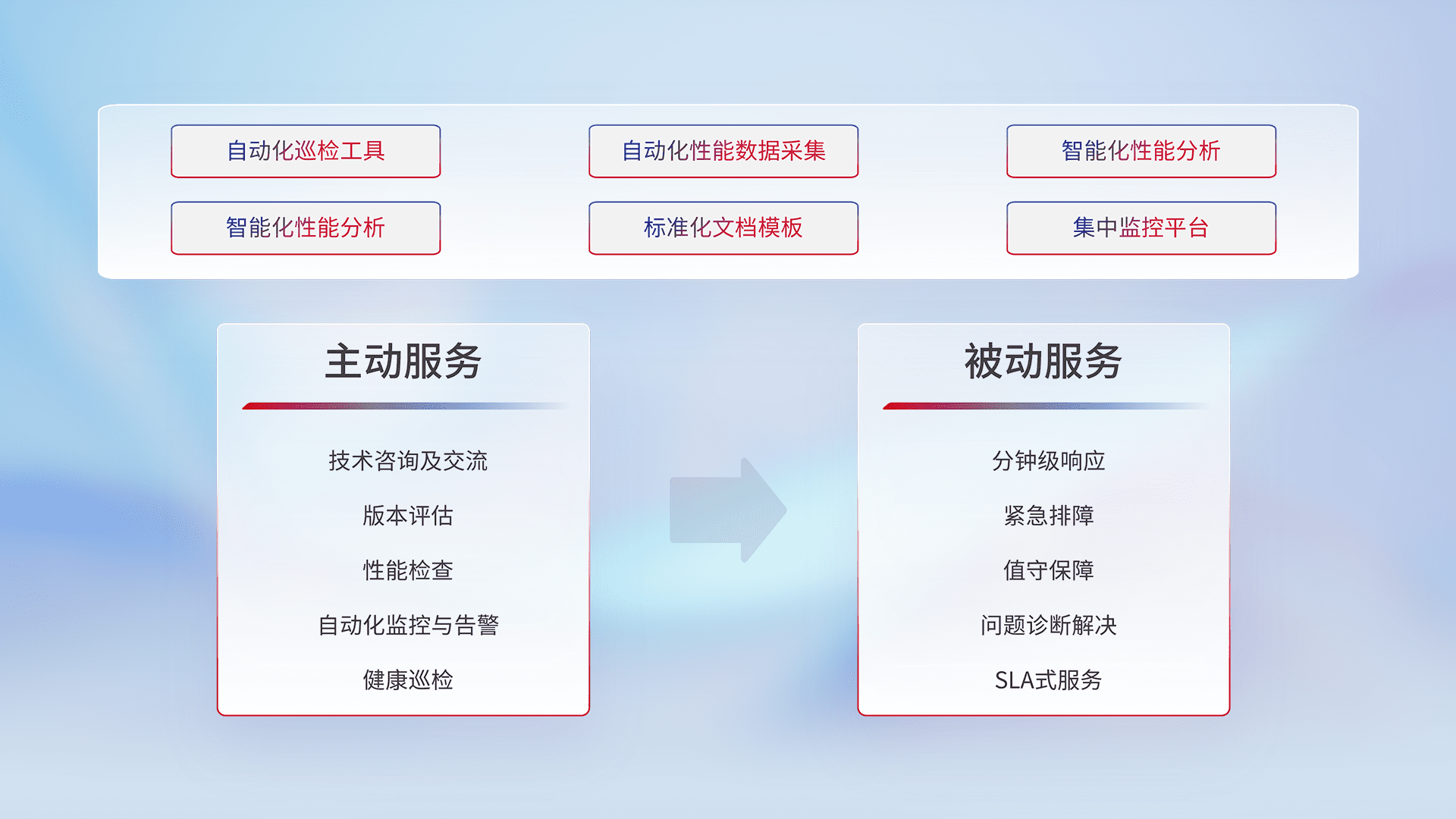 智能化工具和标准化文档,,,保障服务质量,,,,提供主动服务(包含技术咨询、、、、版本评估、、性能检查、、、、自动化监控与告警、、健康巡检)和被动服务包含(分钟级响应、、紧急排障、、、、值守保障、、、问题诊断解决、、、、SLA服务)。。
