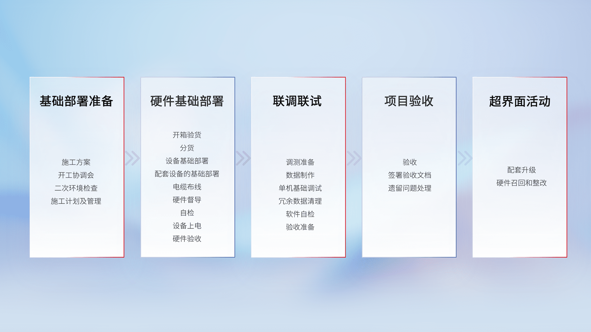 从基础部署准备、、、硬件基础部署、、、、联调联试、、项目验收、、、、越界面活动的全过程可追溯,,保证施工质量和进度。。。